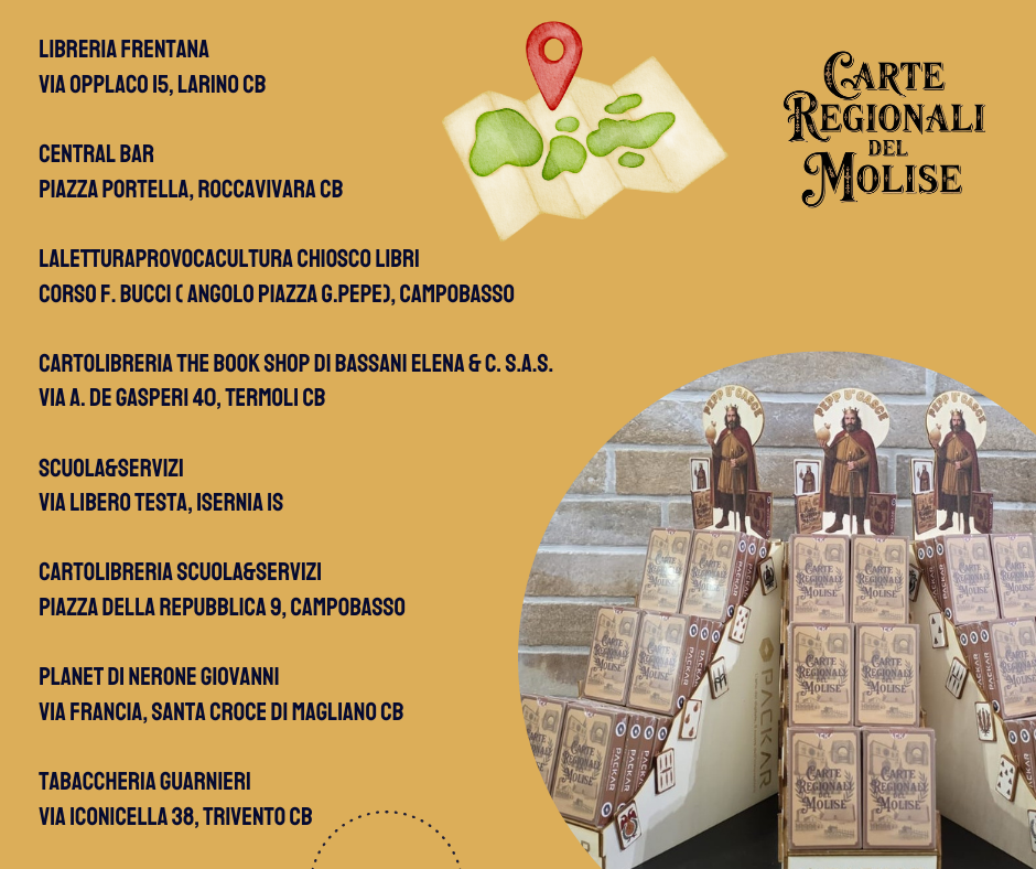 Ogni carta racconta un pezzo d’identità molisana: dalle antiche chiese e i borghi medievali, alle feste popolari, ai riti religiosi e alle leggende tramandate di generazione in generazione.