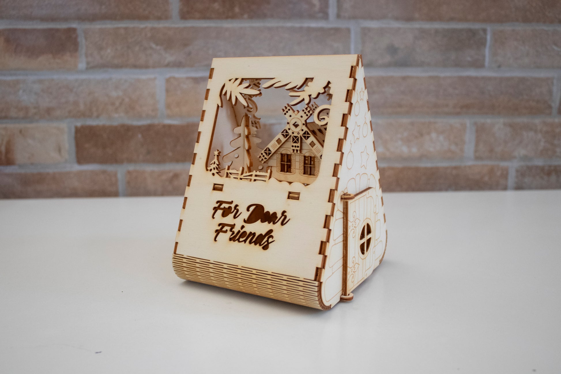Design originale a forma di casetta natalizia, con la scritta “For Dear Friends”
